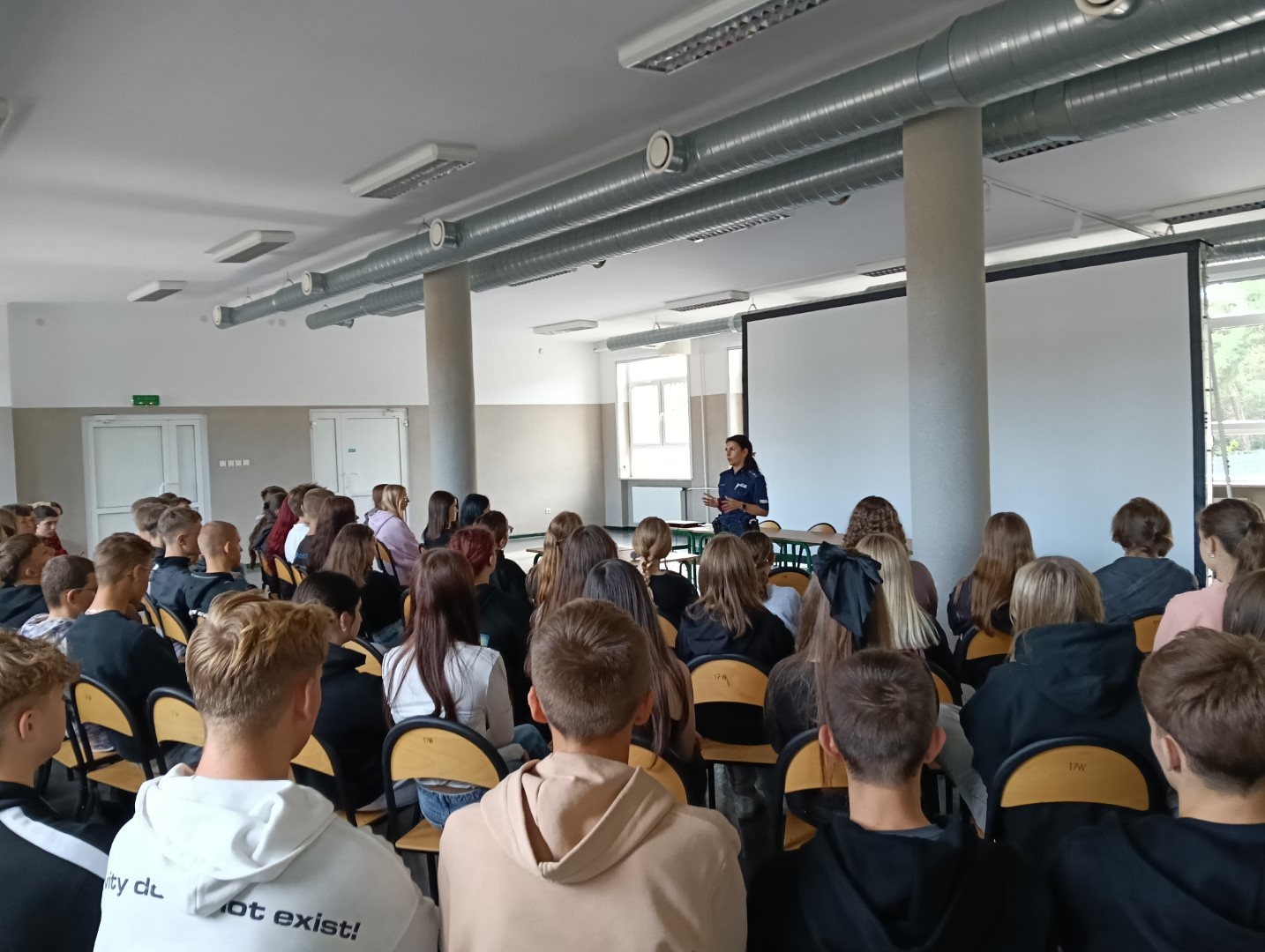 Funkcjonariusz policji w przystępny sposób przedstawiła zagrożenia, z jakimi mogą spotkać się młodzi ludzie, a także wskazali, jak odpowiedzialnie i bezpiecznie zachowywać się w różnych sytuacjach.